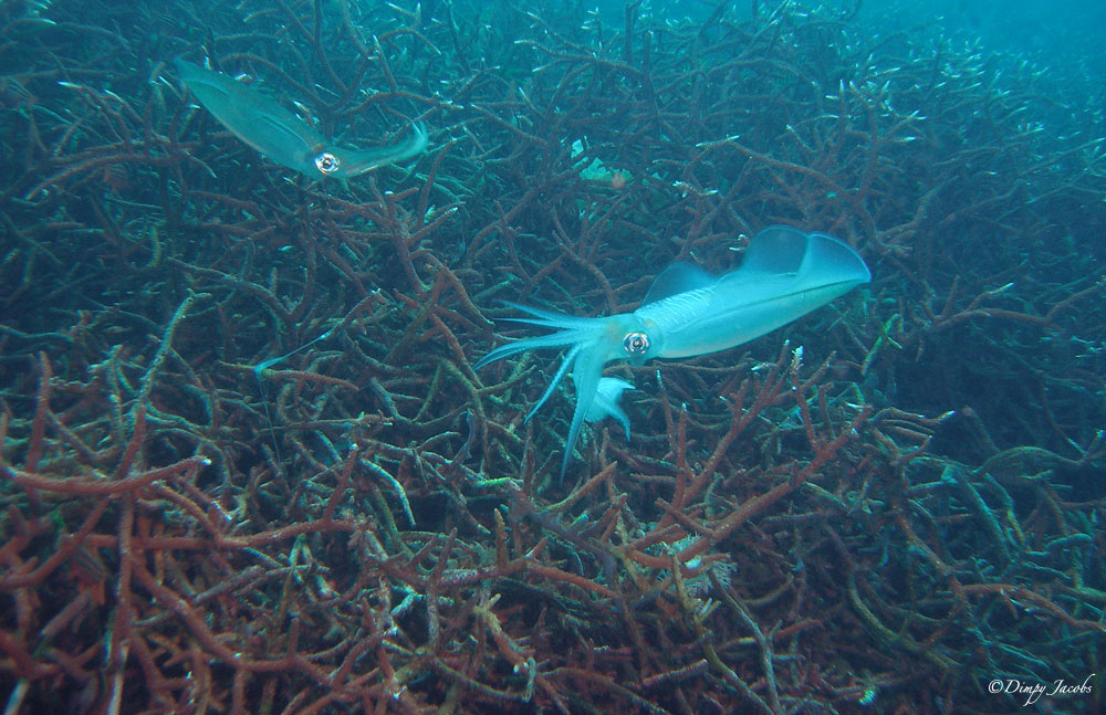 Following this whirlwind fish market expedition, we set off to observe and film spawning and egg laying behavior on Lembeh Island. Upon arrival, we found a school of ~15 big fin reef squids engaging in spawning behavior over a bed of staghorn (Acropora) corals! This was extremely exciting as this is the first time I have seen my study organisms in the wild! I think I normally spend too much time staring at reef substrate looking for other things to look around and see them :-). With the help of Tyler (a fellow Barber lab graduate student) and Dimpy Jacobs (the marine biologist at critters@lembeh), we filmed ~2 hours of spawning behavior and egg laying at this site. There seemed to be one mating group that had the most interactions and patterning displays. There was a large male who kept displaying a half white – half brown pattern and flashing it as he neared the coral bed. This is similar to the “lateral silver” pattern observed in the closely related Caribbean Reef Squid (Sepioteuthis sepioidea) that is characteristic of a male guarding a female that he has mated with (Byrne et al. 2003). Squids are extremely communicative through visual patterning on the skin – to signal aggression, use as camouflage, and signal and attract potential mates. While there has been studies documenting this behavior in the Carribean reef squid (S. sepioidea) (read more about this here), this behavior has not been substantially examined in the big fin reef squid, particularly not in Indonesia. Furthermore, as my research and some previous work (namely the work from Ishigaki Island, Japan and Shark Bay, Australia) shows that multiple different species of big fin reef squid occur in the same localities, it will be interesting to observe if there are corresponding differences in reproductive behavior and characteristics! Now to comb through all the footage and document specific patterns, postures and behaviors!